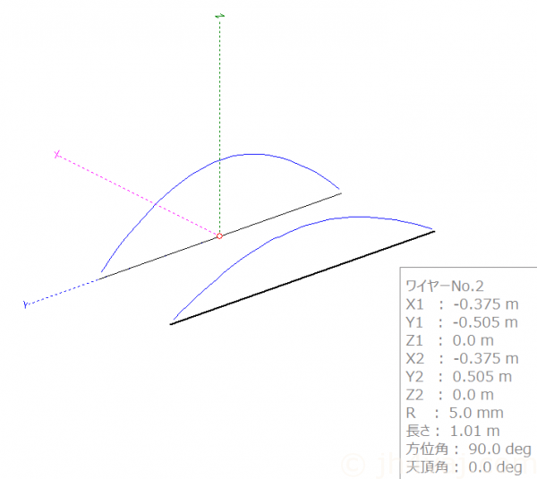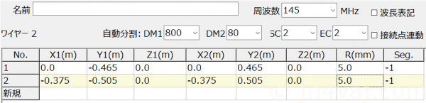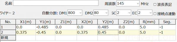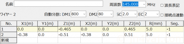 ということで、MMANAを使ってシミュレート。周波数は、145MHz。なんとなく。