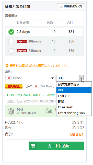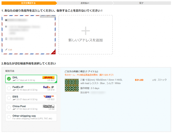 2層、100×100mm、10枚で$5。このあたりは他社と同じ。しかし、24時間と爆速。これはすごい。