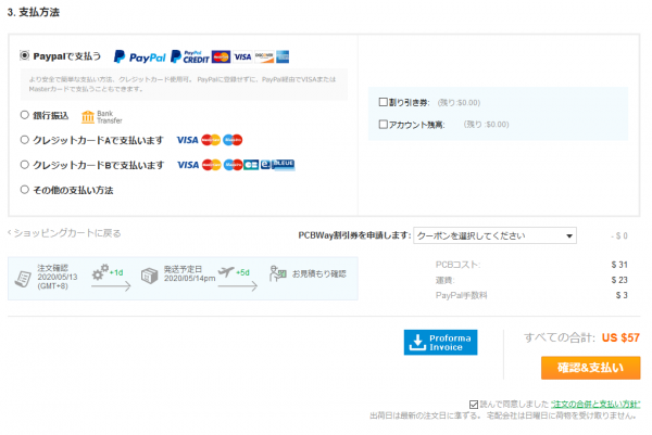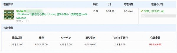 あれ?$5じゃなくて、$31になっている…。注文設定を色々変えて確認してみたら、V-cut指定すると追加料金が発生するらしい。パターンが一種類てあっても。二種類以上だともっと高くなる。他の業者だと同一パターンの場合は追加料金が発生しないところもあるけど、PCBWayではこういう料金体系のようだ。