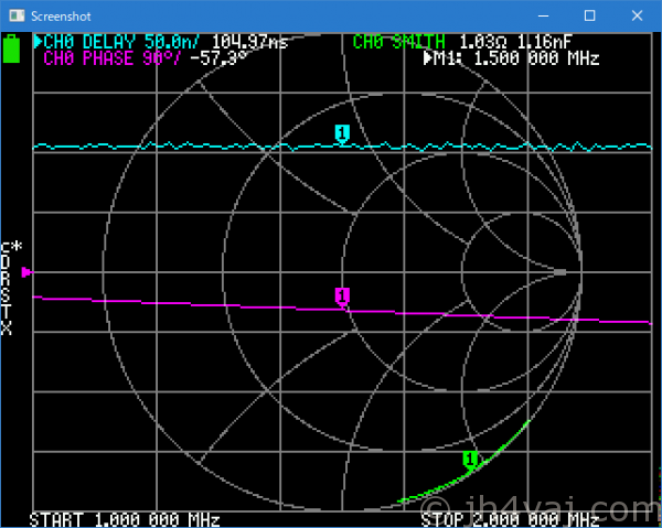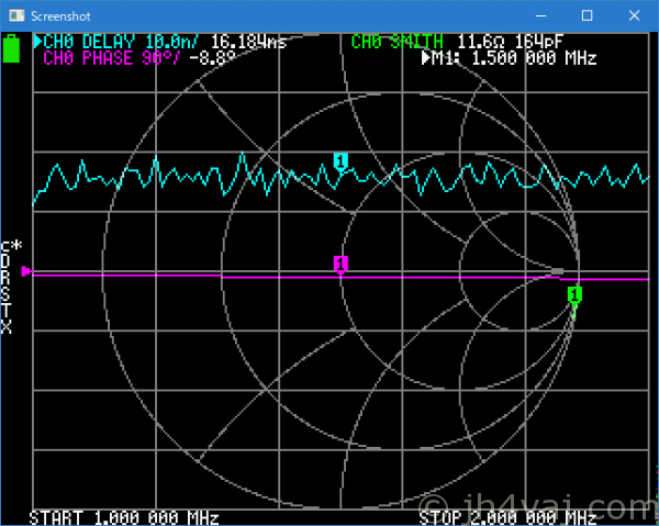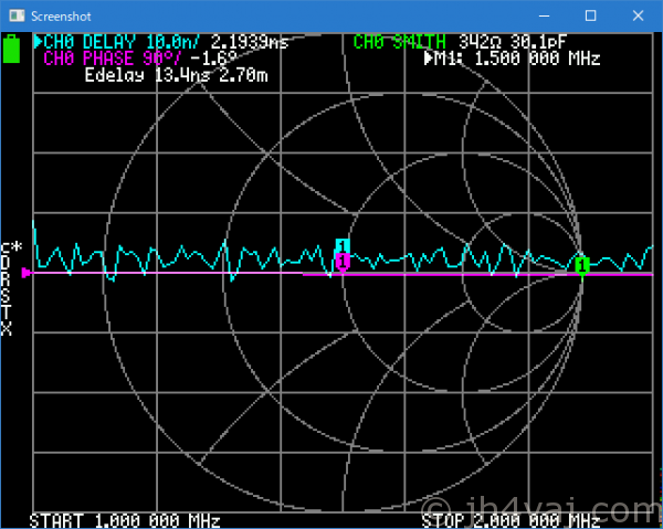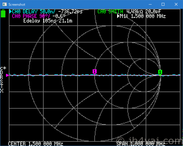 ポイントは、測定周波数範囲を狭くすること。DELAY(遅延)は周波数には依存しない(無関係)なので、どこでもいい(はず)。上の例では、1MHz~2MHzにしている。この測定範囲で位相が回っていないことを確認するために、SMITHチャートをチェックしている(半周以上回ってはダメ)。