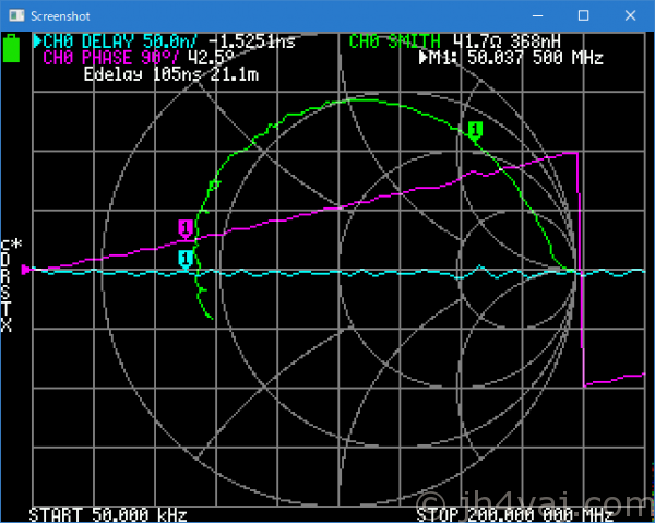「アンテナの測定はアンテナの給電点(同軸ケーブルの先)で」と言われるが、実際にそのようにするのはなかなか難しい。でも、ELECTRICAL DELAYを適切に設定すれば同軸ケーブルの先での測定と同じようにできる(ただし、同軸ケーブルによる損失があるので、実際のSWRよりは良く見える)。
