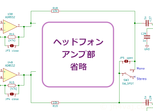 バッファから出た信号はヘッドフォンアンプ(AD8532の片割れ)とスピーカ用のアンプ(R18経由)に行きます。R20はデータシートでは16Ωですが、入手が容易な15Ωにしました。22Ω位でも大丈夫だと思います(ヘッドフォンの音量が少し小さくなりますが)。