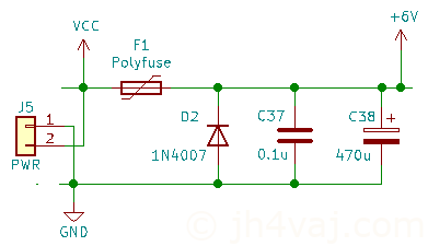 安全のために、フューズ(ポリスイッチ)と、ダイオード(逆接続時の保護)を入れています。ノイズ除去のためにコンデンサを入れていますが気休め程度かもしれません。どうせ入れるならC38は大きい方が良いと思います。スペースの都合に合わせて適当なものを。