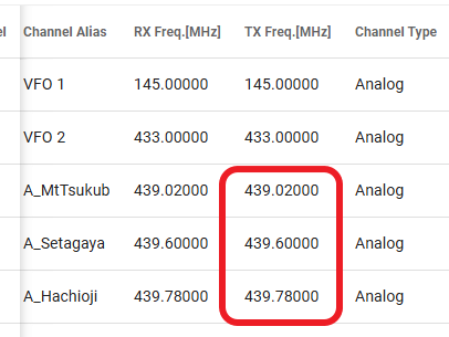 この例ではアナログレピータを三つ、UHFデジピータを三つ、VHFデジピータを二つ登録した(UHFデジピータを「D_」としたのは、「U_」だと「V_」と紛らわしいため)。