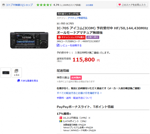 そのIC-705の方は、115,800円に17%が最安みたい。何軒か同額・同条件で出ている。とりあえず、一つ。