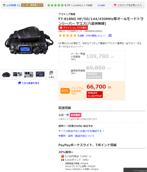 最安値は今回も変化なし。66,700円、ポイント類が20%(9,338+4,002)で、差引き53,360円(相当)。ショップは山本無線CQ。
