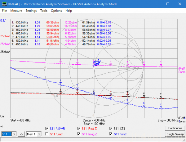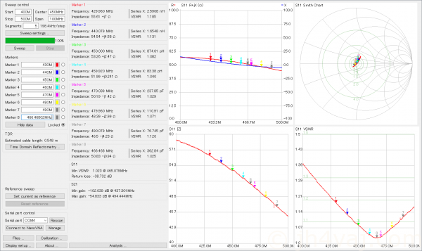 面倒なので、VSWRだけ。最低点は、469MHz付近で1.03程度。これまた、最低点周波数がちょっと違う。また、400~500MHzの範囲で一番高いところ(400MHz)が1.4弱と出ている。まぁ、全体的傾向は同じだけど。