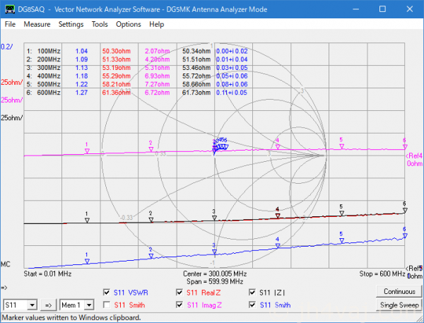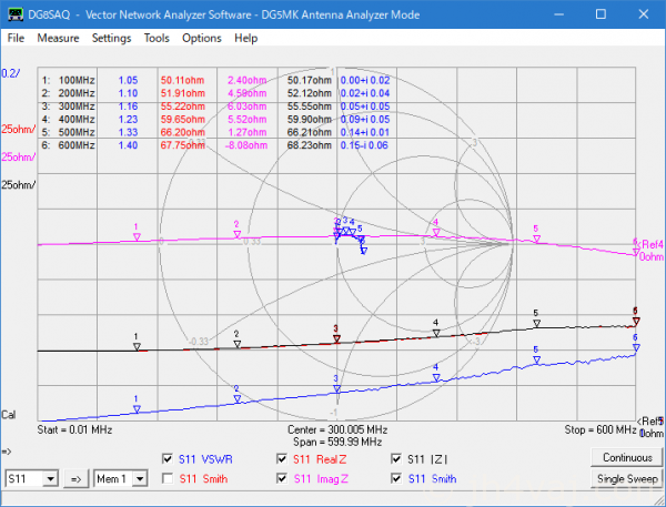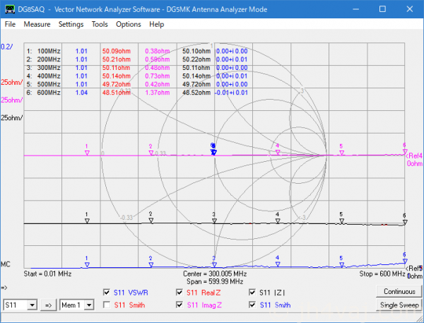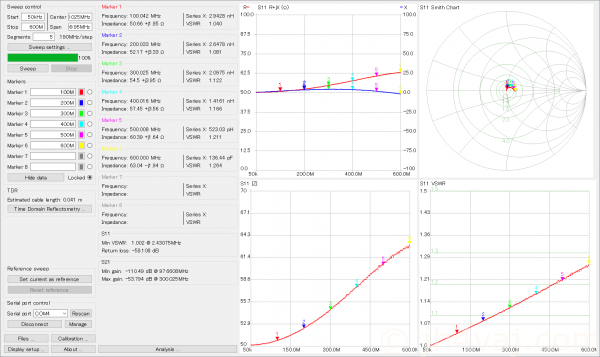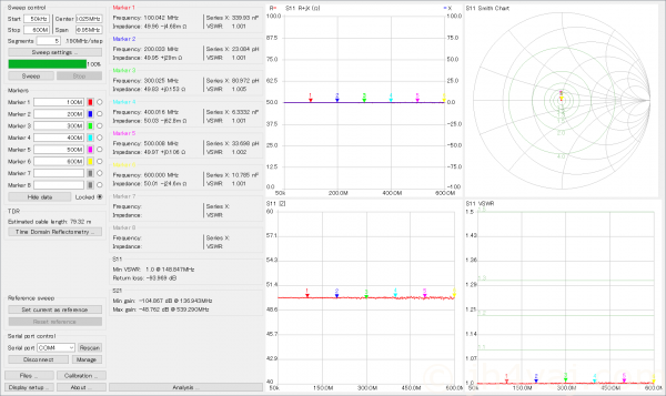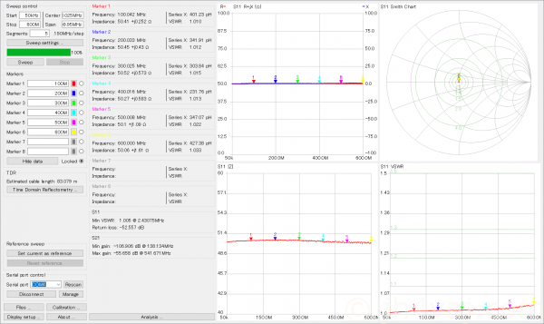 残念ながら600MHzより上は特性が悪化する。VSWR 1.1以下という条件なら1GHz程度まで?とはいえ、これくらいより上になるとNanoVNAの特性もよくなくなるのでどっちの特性を見ているのかわからないが。