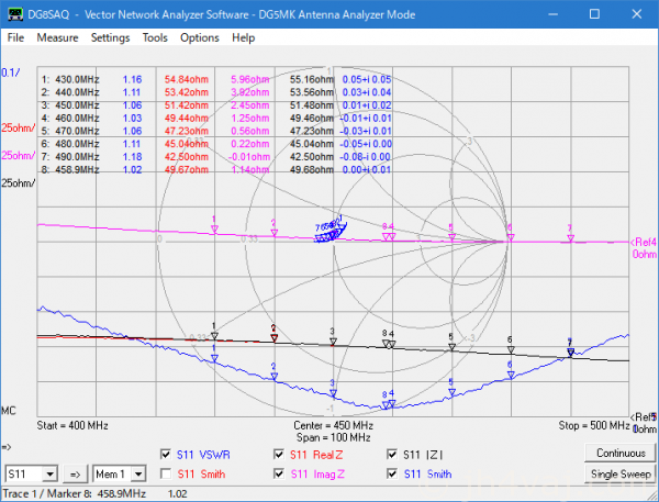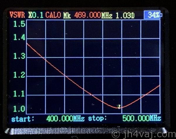 だいたい同じような形だけど、VSWR最低点は約460MHzで1.02。周波数が6MHzも違うのが気になるけど、460MHzに対して6MHzということは1%ちょっと。こんなものなのかなぁ?何しろ、帯域が広い(400MHzから500MHzの範囲でVSWRは1.2以下)のでなんとも判断が難しい。