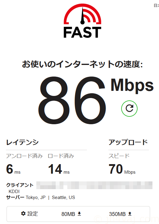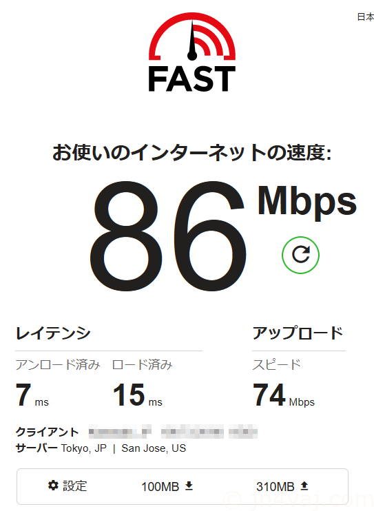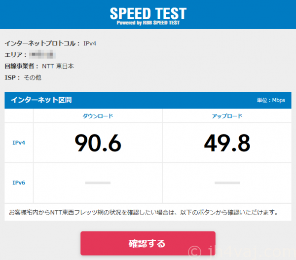 混雑している日曜の夜(20時頃)でこれくらい出た。なかなか良い。IPv6をオフにしてIPv4 over IPv6でもこんな感じ。