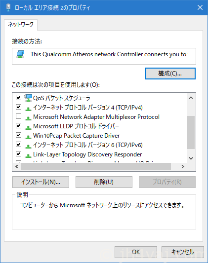 「インターネットプロトコルバージョン6 (TCP/IPv6)」のところ。ここにチェックを入れる。最近のOSならデフォルトで使えるように設定されているとは思うが。