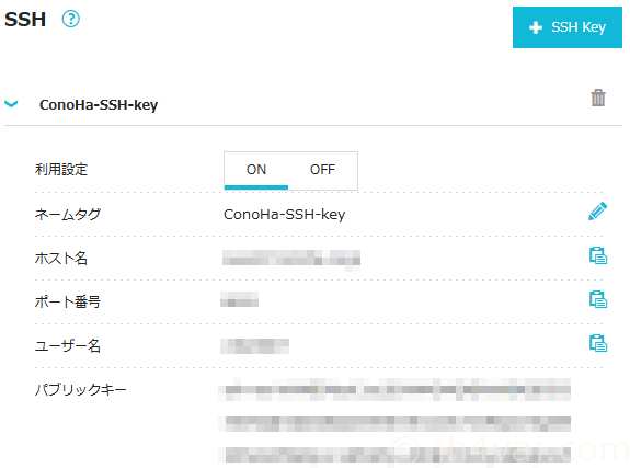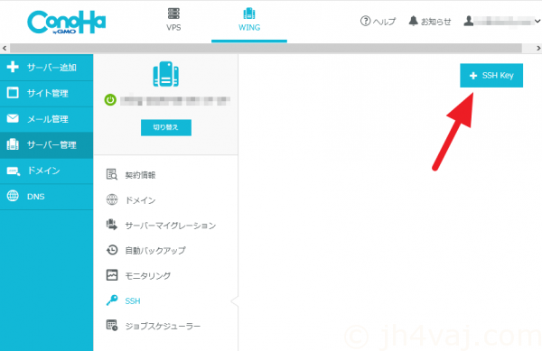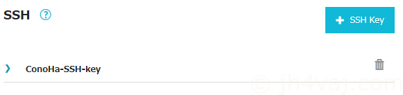 ConoHa WINGの管理画面で、「サーバー管理」→「SSH」とたどり、右上の「+ SSH Key」ボタンを押す。
