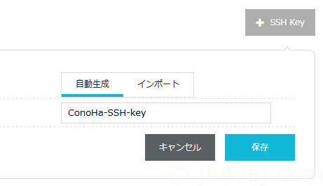 「自動生成」で適当な名前をつけ(ここでは、ConoHa-SSH-keyとした)、「保存」を押す。
