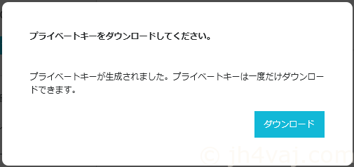 プライベートキーをダウンロードするようにと促すポップアップウィンドウ。「ダウンロード」ボタンを押す。