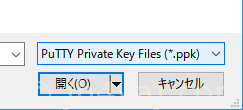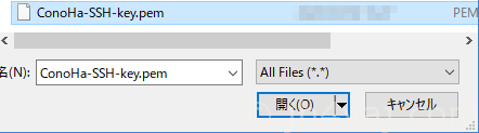 先ほどダウンロードしたプライベートキーファイル(ConoHa-SSH-key.pem)を指定して、「開く」。
