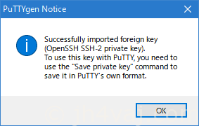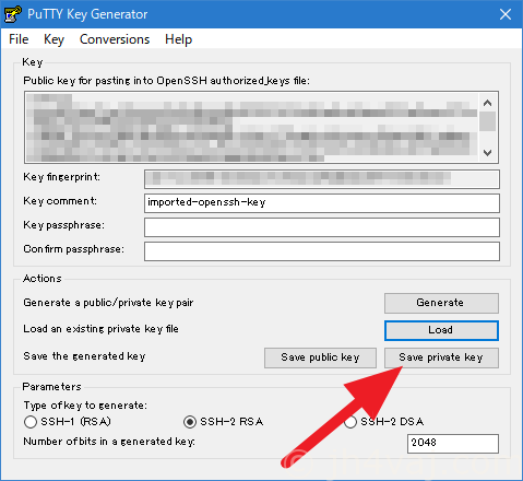 読み込み成功。「Save private key」でPuTTY形式に変換するようにとあるので、それに従う。