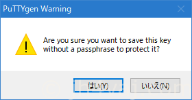 「パスフレーズがないけどいいか?」というような警告。より安全性を高めるなら、前の画面の「Key passphrase」と「Confirm passphrase」に適当なパスフレーズを入れておく。ここでは、省略してこのまま「はい」で進める。