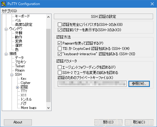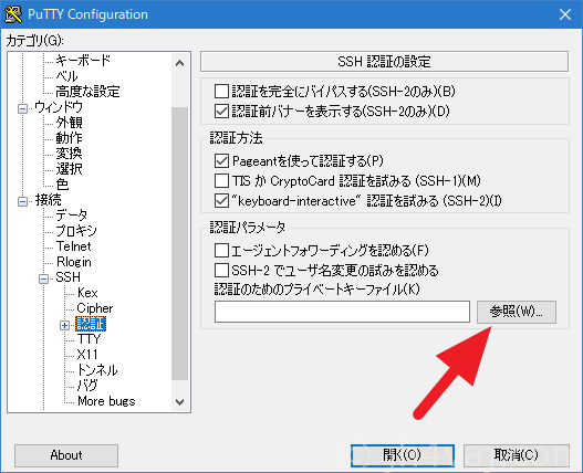 「接続」→「SSH」→「認証」で、「認証パラメータ」の「認証のためのプライベートキーファイル」で「参照」ボタンをクリック。