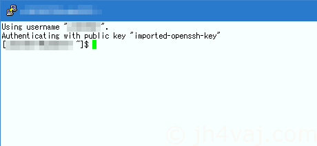 無事、ログインできた。プライベートキーをPuTTY形式に変換する際にパスフレーズを設定していたなら、接続時にそのパスフレーズを求められるはず。