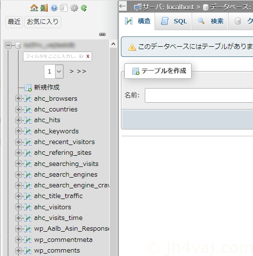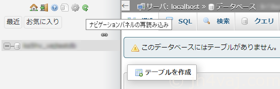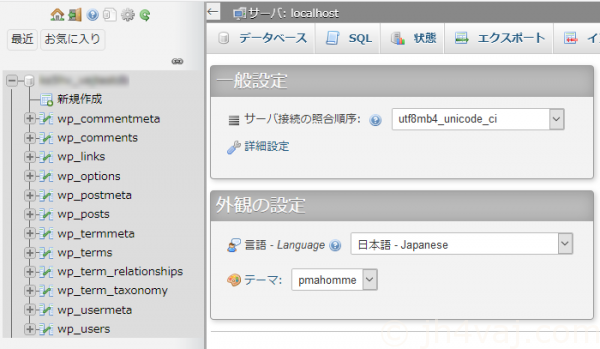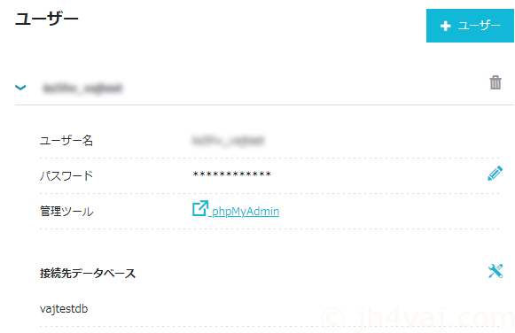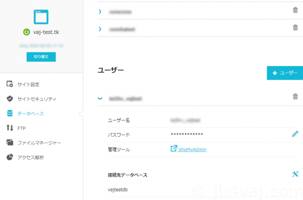 phpMyAdminを開く。それを開くリンクは「データベース」の「ユーザー」の中にある。