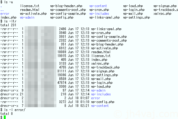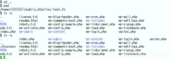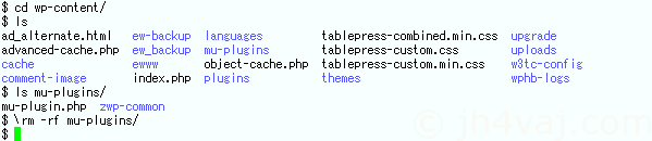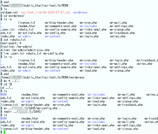 上のキャプチャ画像では、不要ファイルの削除、ファイル群の移動、そして、保存しておいたwp-config.phpの書き戻し(と、保存用に使ったディレクトリの削除)まで行った様子。