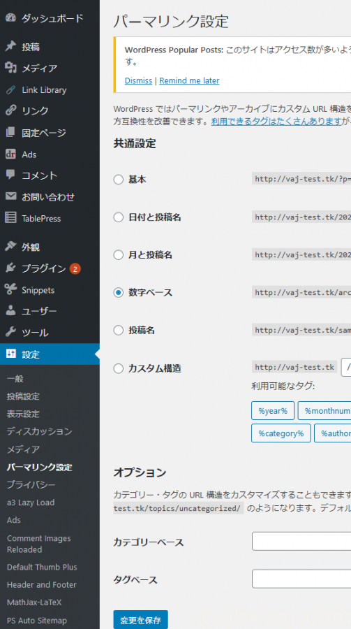 パーマリンク設定を書込み前と書込み後。.htaccessが生成されている。