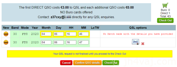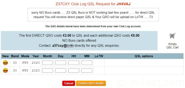 が、よく見たら、「紙カードとLoTWはClub LogのOQRSで直接請求してね」とある。うーん、紙カードはいらないけどLoTWはお願いしたいなぁ。