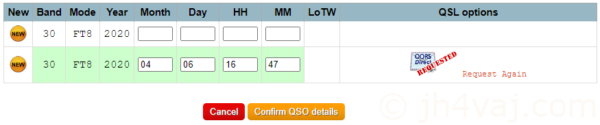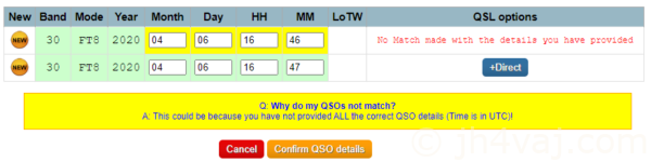 こちらの記録では1 QSOだけなので、その日時を一方に入力。