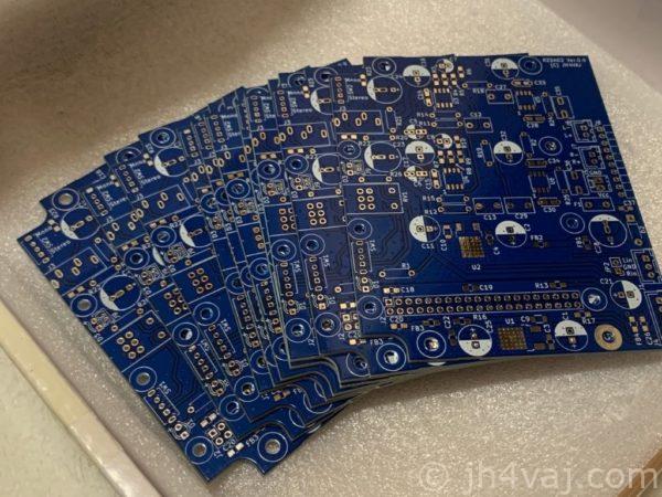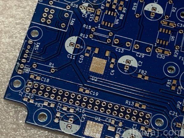 基板は非常にきれい。今回はレジストを青にしたのだけど、結構濃い目の青。おかげで白のシルク印刷がとても見やすい(写真はクリックで拡大)。