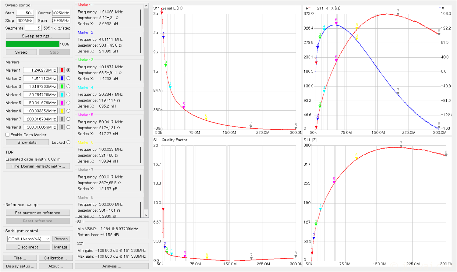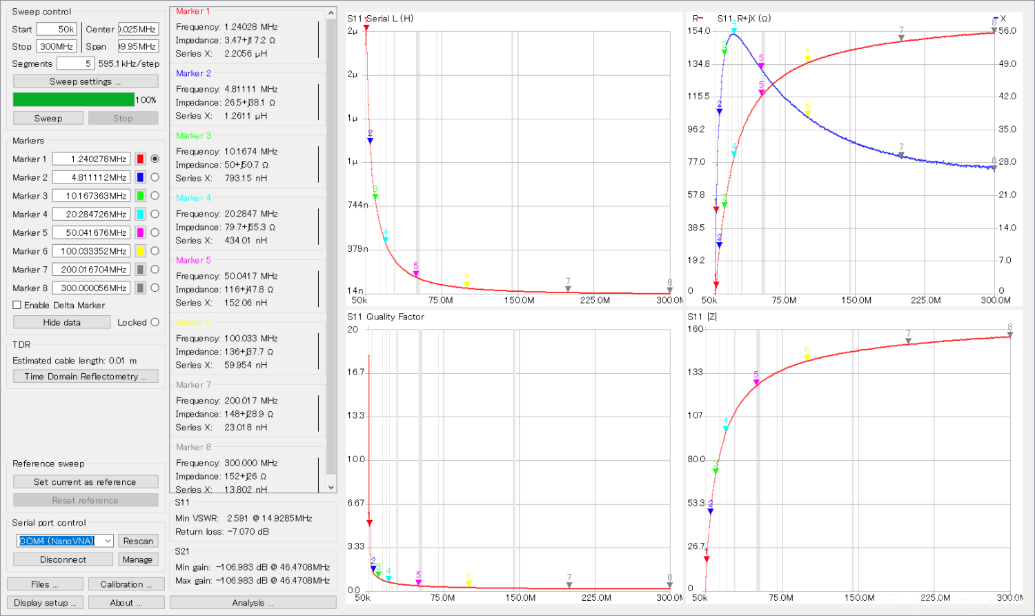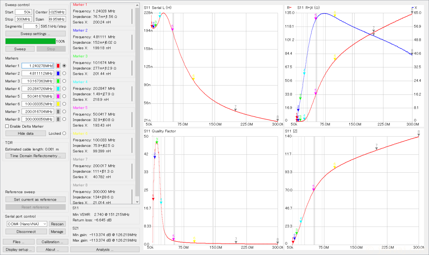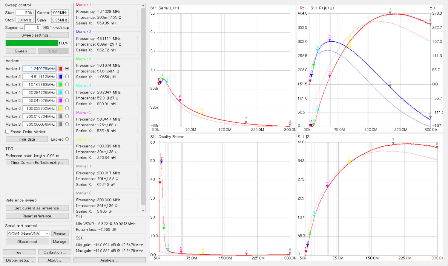 これまでは公称値とか、データシートを参照するくらいしかできなかったが、NanoVNAを使えばこうやって実際に測ることができる。目的の周波数での特性がわかるのは大きい。フェライトビーズに限らず、トロイダルコアに自分で巻いたものを測れるのも素晴らしいと思う(周波数に依存し、計算通りにはいかないことが分かる)。