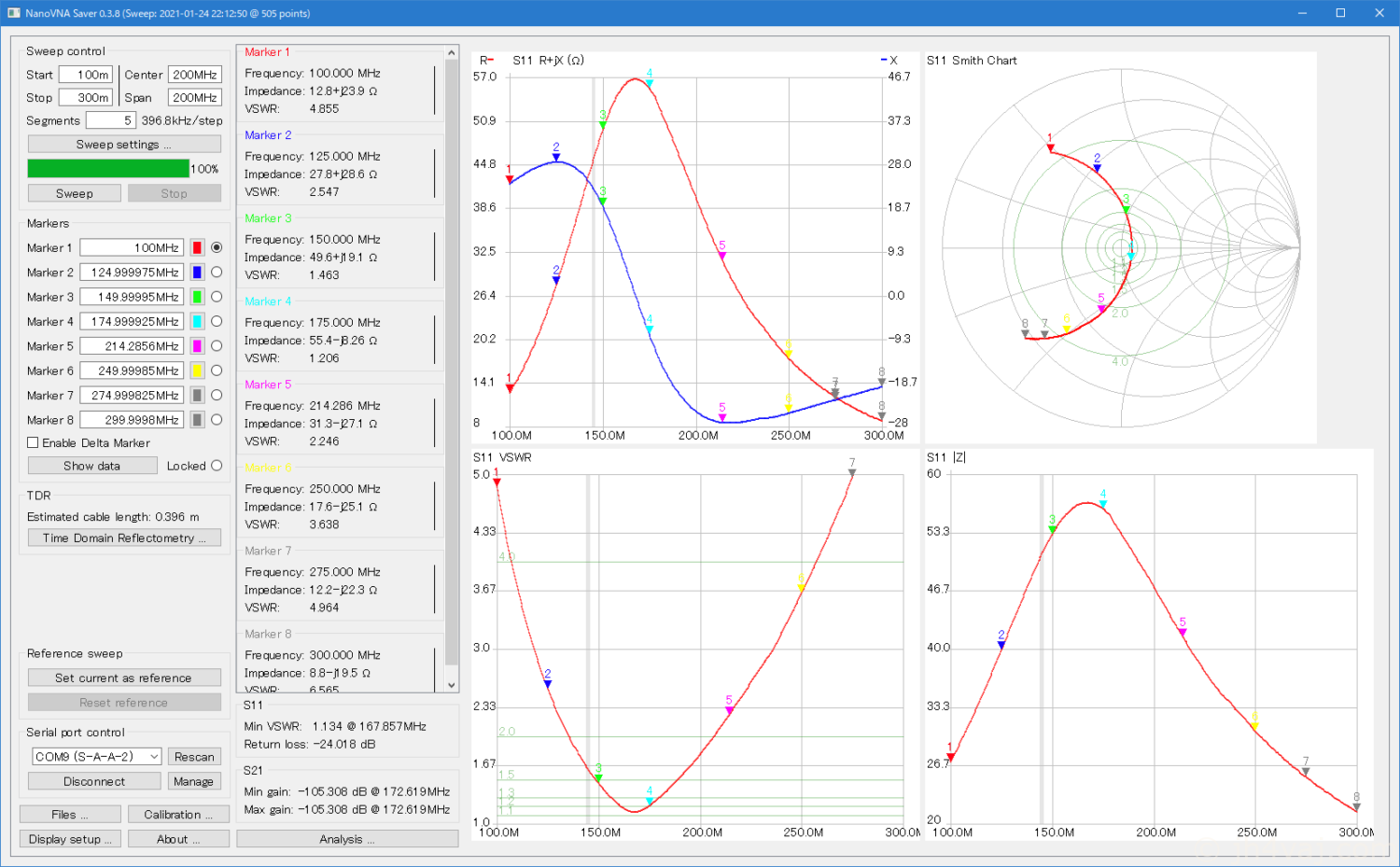 S-A-A-2本体をPCに接続し(もちろん、電源はON)、NanoVNASaverを立ち上げる。