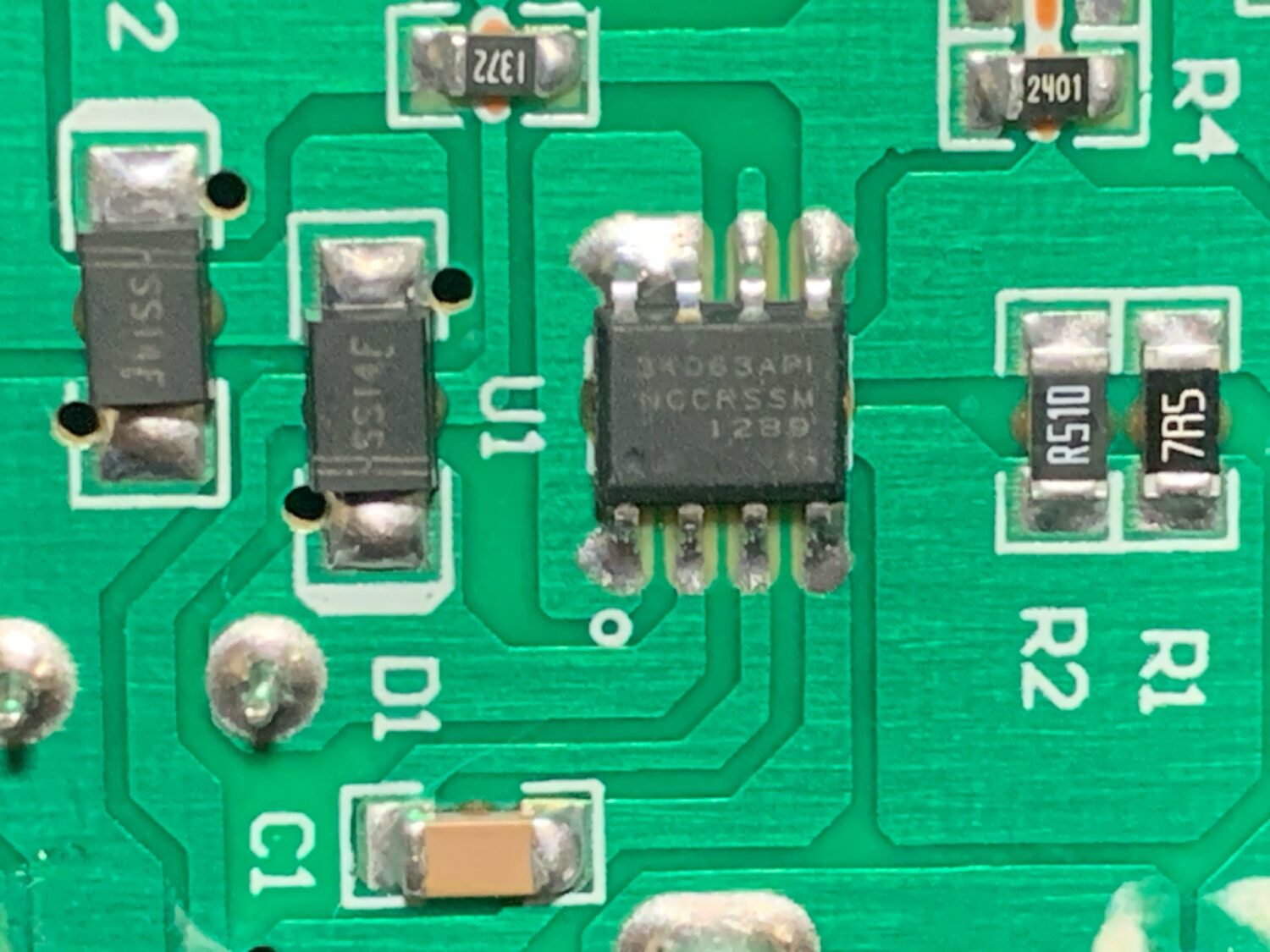 34063A。これはスイッチング式のDC-DCコンバータチップ。