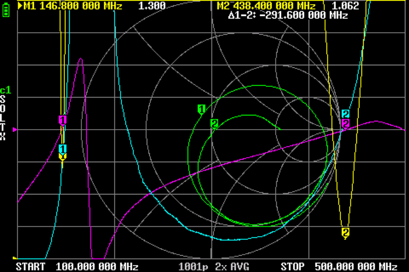 黄がSWR。146MHzあたりと438MHzあたりにSWRが下がるポイント(赤のリアクタンスが0Ωになるポイント)があることがわかる。ただし、これは体をかなり近づけた状態。本体を口に近づけて喋る程度の距離感。体から離れるとボディエフェクトが弱くなってSWRは悪化する(特に145MHz帯の方では顕著)。
