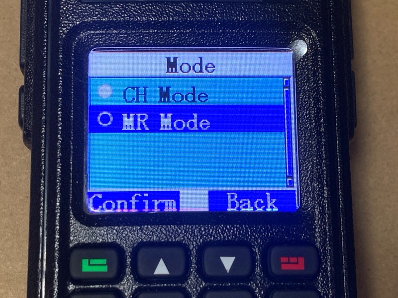 もし、これが「CH Mode」になっていたら、「MR Mode」に変更したうえで、赤ボタンの長押しでVFOモードが使えるようになる。