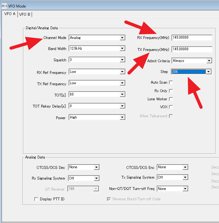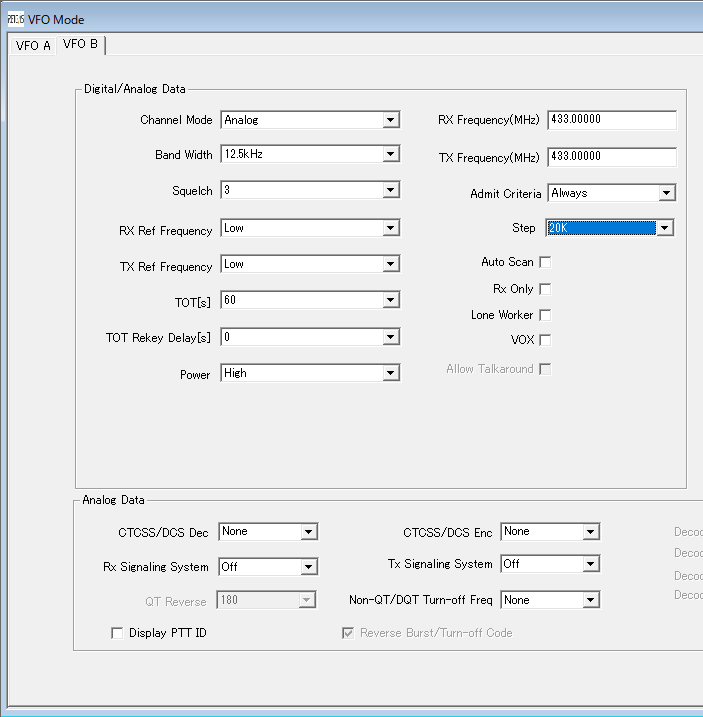 これで書き込めば、通常のアナログ機として使える。VFOツマミは20kHzステップで動くので快適。