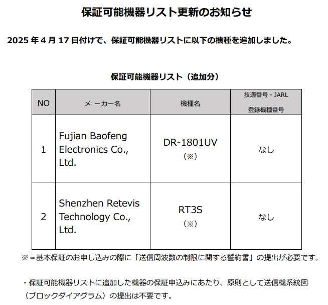 RT3Sは技適機ではないのでJARDの保証を受ける必要があるが、幸いなことに「保証可能機器」のリストに含まれてるので簡単。以下はそのお知らせの引用。