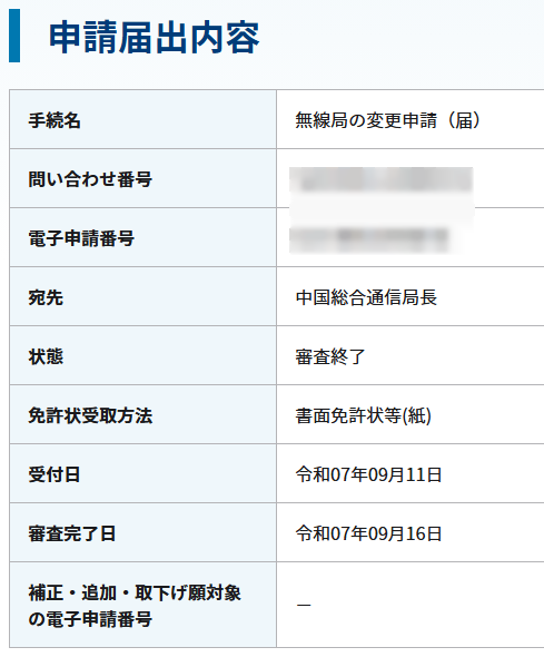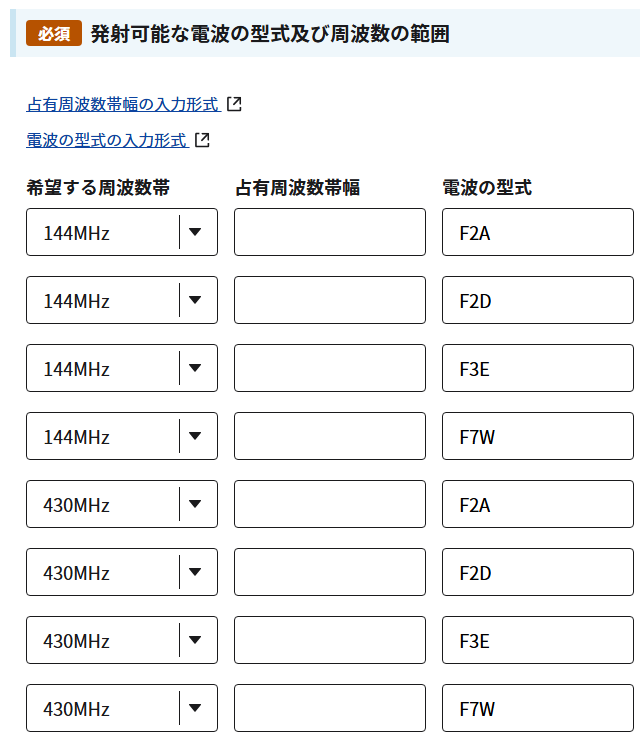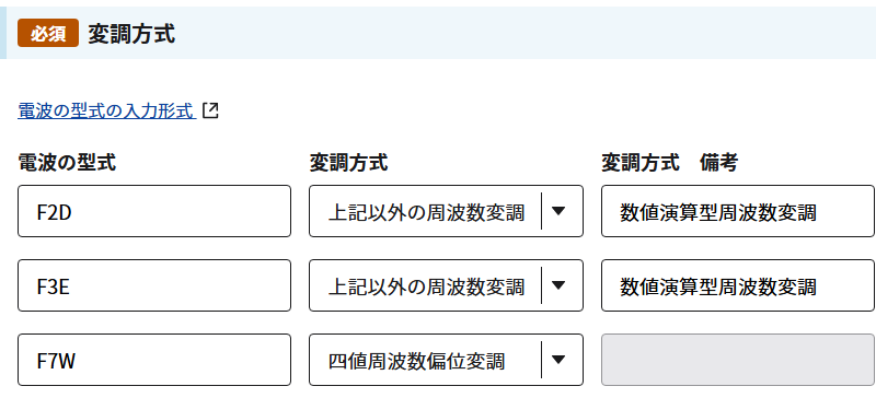 当初、「変調方式」の方の電波の型式にもF2Aを記載していたのだけど、こちらにはF2Aは記載しないようにとJARDから不備の指摘が来たのでそれに従った。ちょっと釈然としないけど、目的は保証を受けることなので、言われたとおりに。