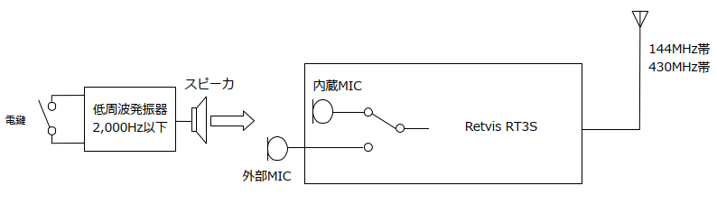 RT3SはJARDの保証可能機器なので送信機系統図は不要なのだけど、上述の通り、F2Aを書いていたため、「マイク経由なら送信機系統図を添付せよ」との指摘も受けた。マイク経由にするつもりはなかった(マイク端子に直接入力の予定)ので送信機系統図を付けなかったのだけど、指摘されたし、補正のついでだからマイク経由を表す図を添付した。