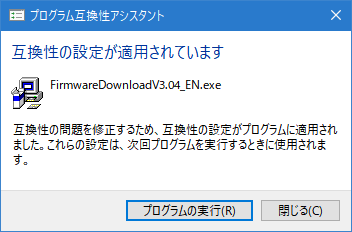 そして、「FirmwareDownloadV3.04_EN.exe」が書込みツール。これをダブルクリックするとインストーラが起動する。すぐに「プログラム互換性アシスタント」というウィンドウが出てくる。これは「プログラムの実行」をクリックするとインストールされる。