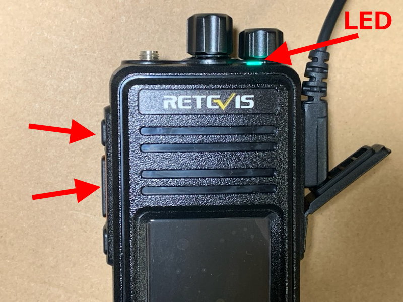 RT3SのPTTボタンと、その上のボタン、両方を押しながら電源スイッチを入れる(DFU(Device Firmware Update)モードで起動する)。画面は消えたままで、LEDが赤と緑の点滅を繰り返す(これでOK)。