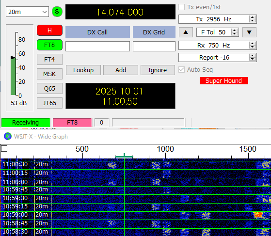 Super Houndモードのときは750Hzの目安が表示されるようになった。これが合っていないとデコードできないので、目安があるのはわかりすくて良い。