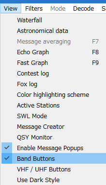それから、操作画面の方ではバンドをダイレクトに指定できるボタンが付いた。これは便利だ、と思ったのだけど、これまでの感覚で「Enable Tx」ボタンを押そうとするとバンド変更ボタンを押してしまいそう。バンドボタンは消すこともできるようなので、消そうかと思っているところ(その方が画面を広く使えるし)。View → Band Buttonsでトグル。