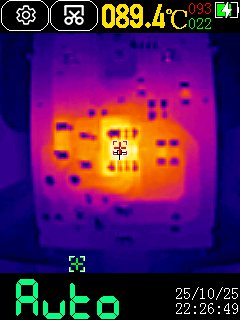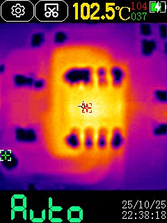 チップに寄ると100℃を超えた数字を表示するけれど、指で数秒間は触れるのでそこまで暑いとは思えない。このカメラ、こんなに寄って測定してはいけないのかもしれない。ともかく、結構高いのは間違いない。
