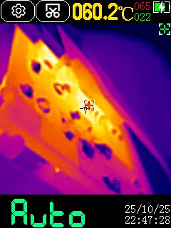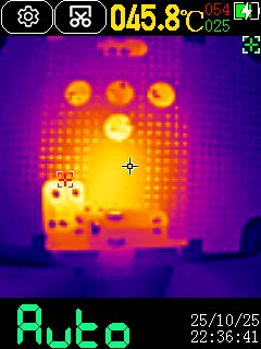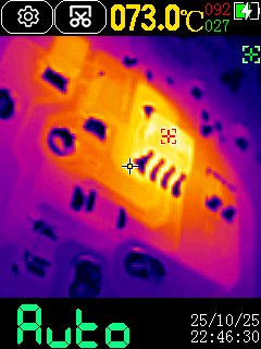 いまいち見方がよくわからないのだけど、多分、上の大きな数字が画面の中央(黒十字)の温度。その横の赤が最高温度地点(赤十字)、緑が最低温度地点(緑十字)の温度だろうと思う。ただし、温度の確度もよくわからない。高そうだ、低そうだの参考程度。