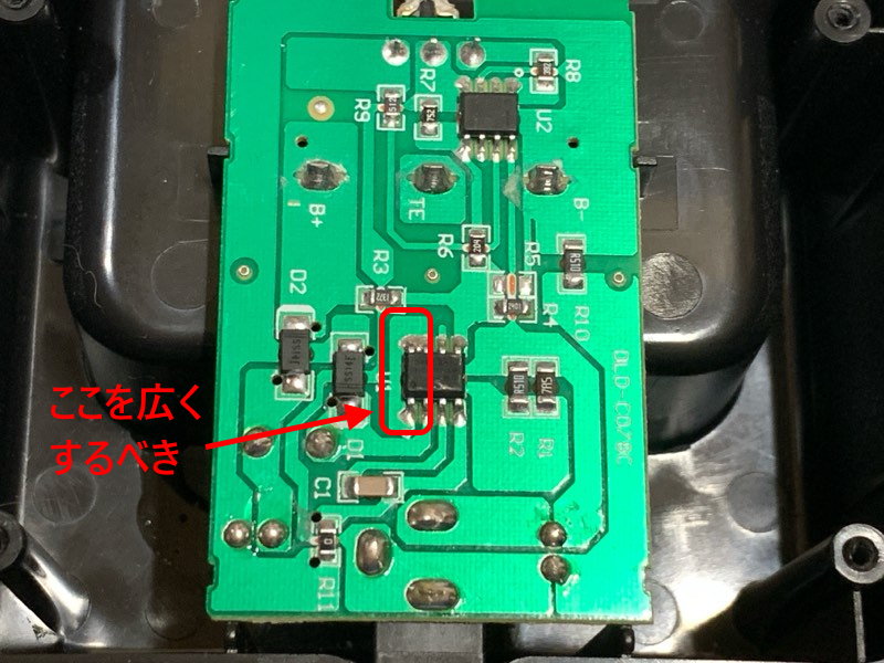 本来なら基板パターンを広く取って放熱させる設計にすべきなんだけど、そういうパターンになっていないので熱を放出できない。