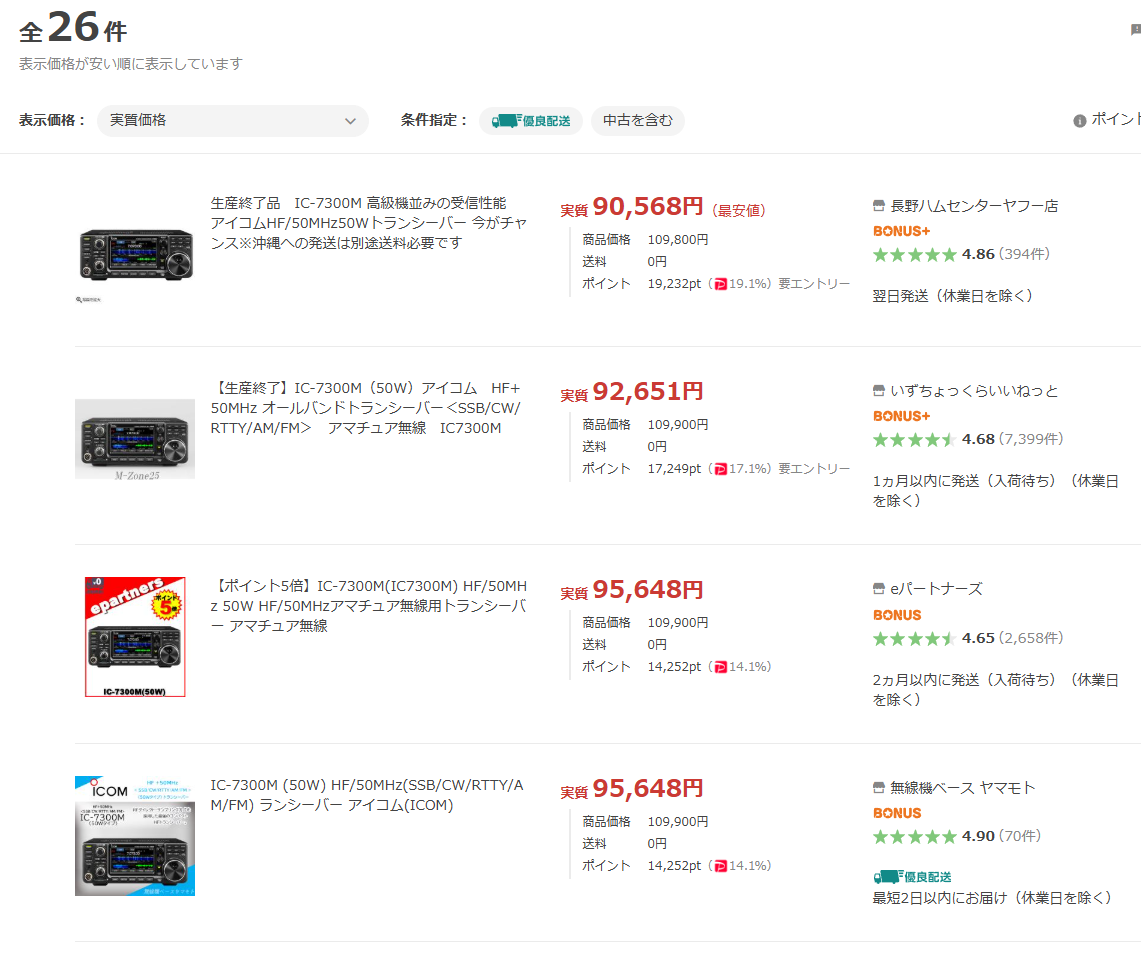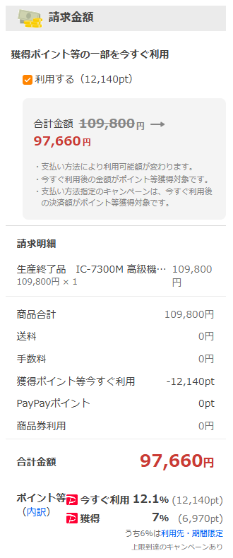 支払額が97,660円で、獲得ポイントが6,970。差し引きの実質額は、90,690円。前回96,865円だったので、6,175円の値上がり。前回まではジワジワ値上がりしていたが、ここで一気に大幅値下がり。しかも「プレミアムな日曜日」ではないのに。これはもしかしたらIC-7300MK2の発売が近いのか?ハムフェアでアイコムの説明員さんに聞いたときは「年内発売予定」って言っていたし。