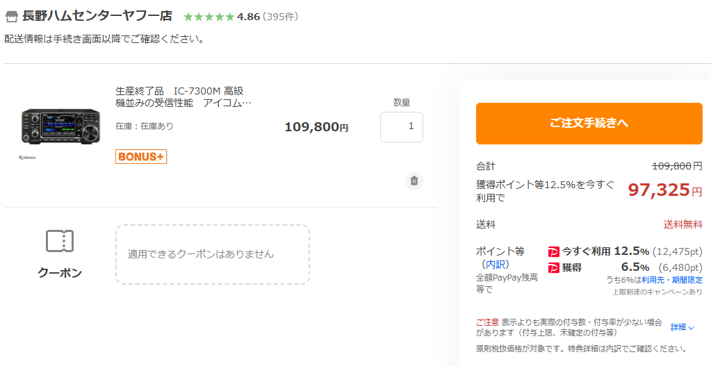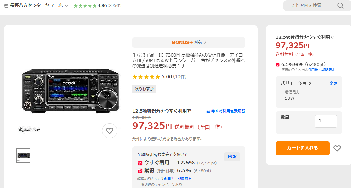 「長野ハムセンターヤフー店」のIC-7300Mの販売ページのリンクはこちら。