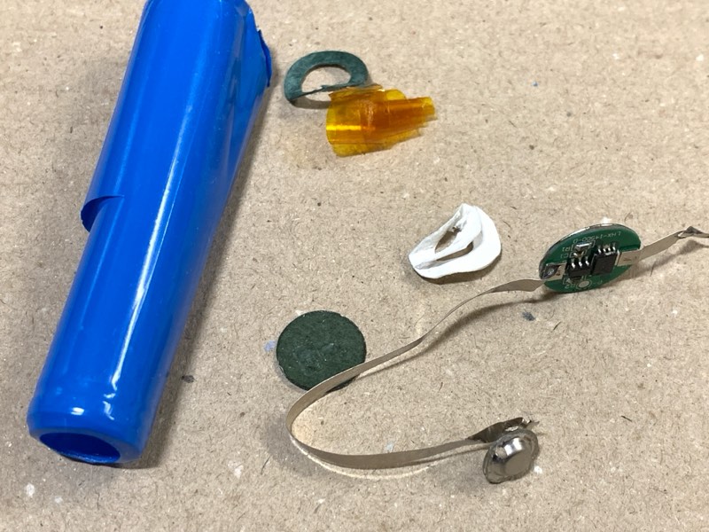 なるほど。中から出てきた。マイナス極側に基板が付いている。