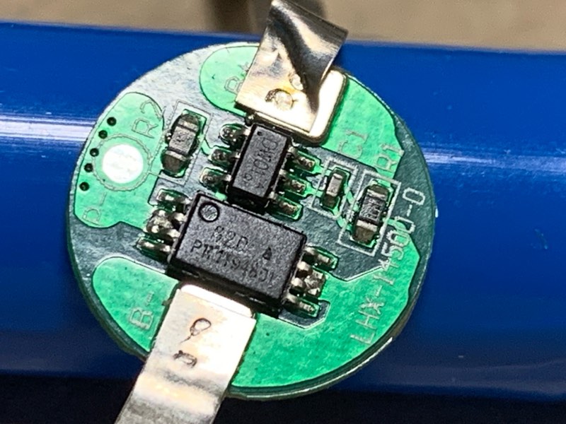 マーキングは非常に読み取りづらいが、おそらく、DW01A(検出・コントローラ)と8205A(MOSFET)の組合せ。どうやらこれがデファクトスタンダードっぽい。過充電、過放電、過電流の保護をやってくれる。