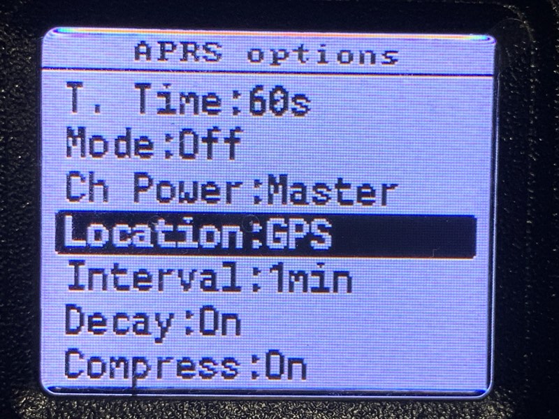 RT3S本体(というか、OpenGD77)では、GPSの設定とAPRS送信の設定を行う。